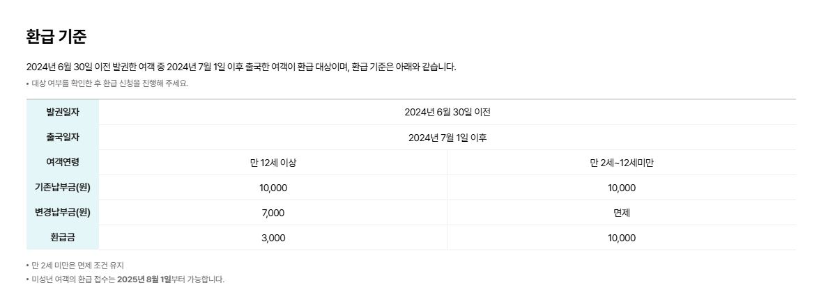 | 어린이(만 12세 미만) | 2024.7.1 이후 출국 | 10,000원 전액 | 2025년 8월 1일~ |